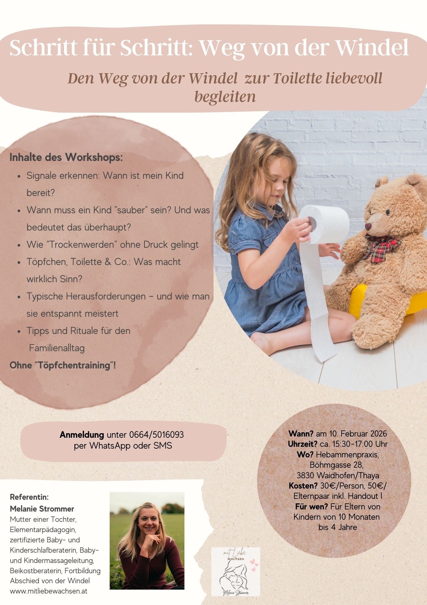 Der Workshop richtet sich an Eltern, die ihr Kind liebevoll, bedürfnisorientiert und ohne Zwang auf diesem Weg begleiten möchten.